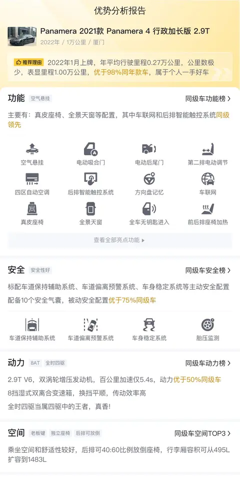 这辆保时捷Panamera 2021款 Panamera 4 行政加长版 2.9T的优点是使用很少,3年1万公里,低于正常家庭使用频率,而且报价87.8万相较于新车来说便宜了不少,性价比高。这车开出去有面子,适合商务接待,家用也不错。