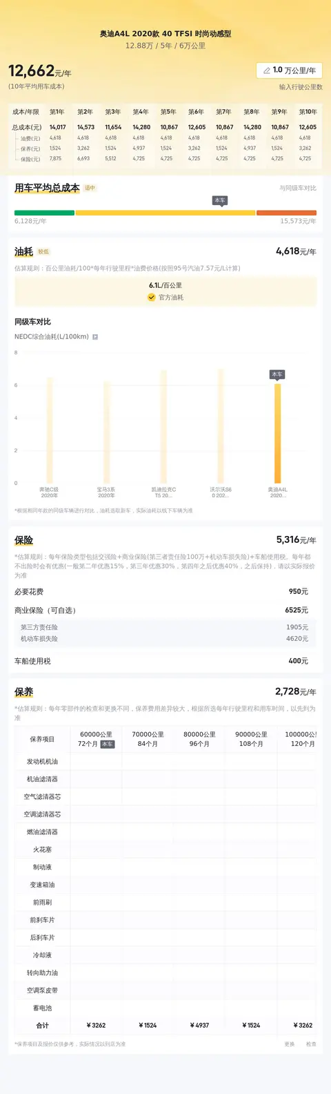 按照每年行驶 2 万公里计算,奥迪A4L 2020款 40 TFSI 时尚动感型的两年油费大约为 13665 元。这一计算基于当前油价为 6.71 元/升的假设。实际上,油价会受到市场供需关系、政策调控等多种因素的影响而波动。