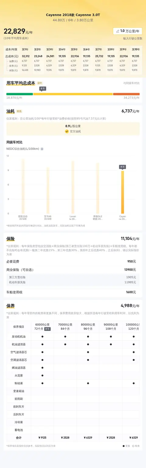 车买来就是要开的,所以用车成本也是大家非常关心的。在这辆Cayenne 2018款 Cayenne 3.0T中,我们估算了一下,大约每年在2.3万元左右(按照每年行驶1万公里计算),至于这项花费高不高,还需要结合您的经济实力来决定。