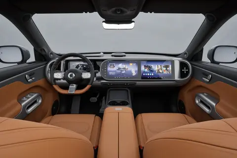 进入车内,smart #5 EHD 超级电混延续了家族 “科技与温度并存” 的设计理念,中控台采用简约环抱式结构,配备 10.3 英寸液晶仪表 + 双 13 英寸 AMOLED 屏幕组成的三联屏布局,支持主副驾区分显示。同时搭载 25.6 英寸 AR-HUD 抬头显示功能,科技氛围十分突出,车内内置 AMD V2000 桌面高算力芯片,并配备豆包 AI 大模型语音交互系统,操作体验流畅便捷,内饰提供曜石黑和浅蜜棕两种配色选择,满足不同审美需求。驾驶辅助相关配置上,在豪华品牌中率先实现“端到端”大模型,搭载NVIDIA双Orin X 芯片(算力508 TOPS)&激光雷达,可实现全场景LCC Pro、APA及无图高速/城区领航辅助。不同车型将根据配置差异,提供三种不同的感知硬件与算法组合方案。