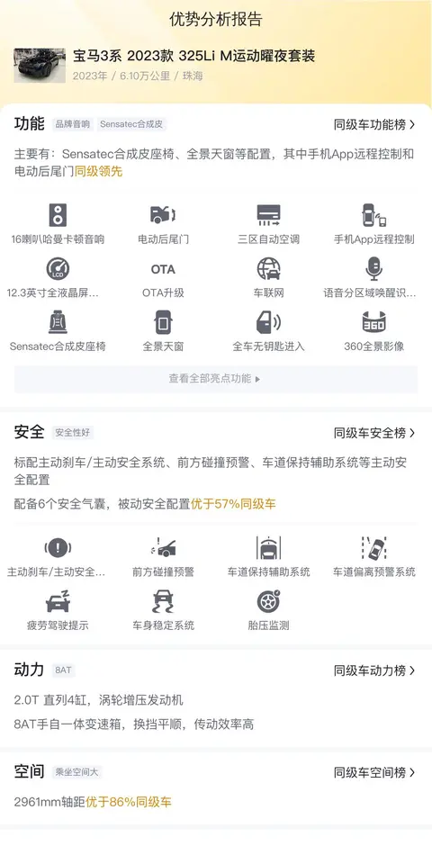 综上所述的新车含税价、用车成本、市场行情、优势分析、同款比价等数据仅供参考。在配置部分,因为二手车非标品,车辆可能会存在配置改装的情况,具体车况信息需要线下结合车辆实际情况进行综合参考。