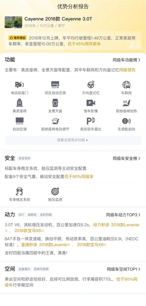 我们先快速了解一下这辆Cayenne的基础信息,它在2018年12月在南宁上牌,至今行驶了10万公里,有2次过户记录。这个行驶里程说明这辆Cayenne的使用频率还是挺高的,不过对于这种豪华车型来说,这个里程数并不算离谱。过户记录方面,2次过户算是正常情况,只要车辆本身没有因此产生过多的折旧或者出现过重大事故,通常都不会对车辆的价值产生太大影响。报价方面,目前这辆Cayenne的价格设定在33.98万,相对于其新车指导价89.5万来说,已经是有相当大的优惠了。