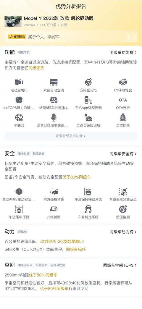 根据懂车帝大数据分析,这辆二手Model Y 2022款 改款 后轮驱动版的市场价格区间合理,考虑到其车况良好、里程适中以及电动车后期保养成本较低等因素,15.55万元的报价具有较高的性价比。在用车成本方面,官方数据显示,这辆Model Y的百公里耗电量约为12.7kWh,结合当前电费标准,预估每年电费支出约为3400元(按一年行驶2万公里计算),这比许多同级别燃油车要经济得多。此外,电动车的保养周期较长,每年的保养费用大约为4100元。保险费用方面,预估每年约为6300元。总体来看,这辆Model Y的年均综合用车成本约为13800元,这对于一款性能出色且配置丰富的电动SUV来说,是非常合理的,尤其是在当前油价高位运行的背景下,其经济性优势更为明显。