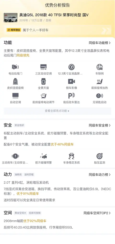 奥迪Q5自2008年问世以来,便以其精湛的工艺、先进的技术及不断的创新,树立了豪华SUV的新标杆。Q5L作为Q5的长轴距版本,专为满足中国市场对后排空间的特殊需求而生。2018款奥迪Q5L 40 TFSI 荣享时尚型,以其卓越的动力系统、智能的Quattro四驱技术、以及一系列高级舒适配置,不仅提升了驾乘体验,更展现了奥迪对细节的极致追求。这款车不仅继承了奥迪家族的优雅血统,更融入了现代都市生活的节奏与韵律,成为那些追求品质生活、渴望与众不同的人士的理想伴侣。今天我们就为您带来一辆二手奥迪Q5L,看看这辆车是否符合您的心意。