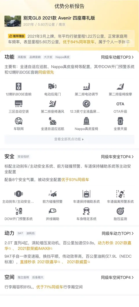 综上所述的新车含税价、用车成本、市场行情、优势分析、同款比价等数据仅供参考。在配置部分,因为二手车非标品,车辆可能会存在配置改装的情况,具体车况信息需要线下结合车辆实际情况进行综合参考。