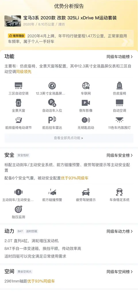 综上所述,2020款改款325Li xDrive M运动套装是一款集运动与豪华于一身的出色车型。它在操控性能、内饰设计、安全配置等方面均表现出色,为驾驶者带来了无与伦比的驾驶乐趣。如果您正在寻找一款既能满足日常出行需求又能展现个性魅力的座驾,那么这款二手宝马3系将是一个不错的选择。最后,请允许我温馨提醒您,购车时一定要选择正规的渠道和可靠的车源,确保车辆的质量和合法性。祝您购车愉快,享受驾驶的乐趣!