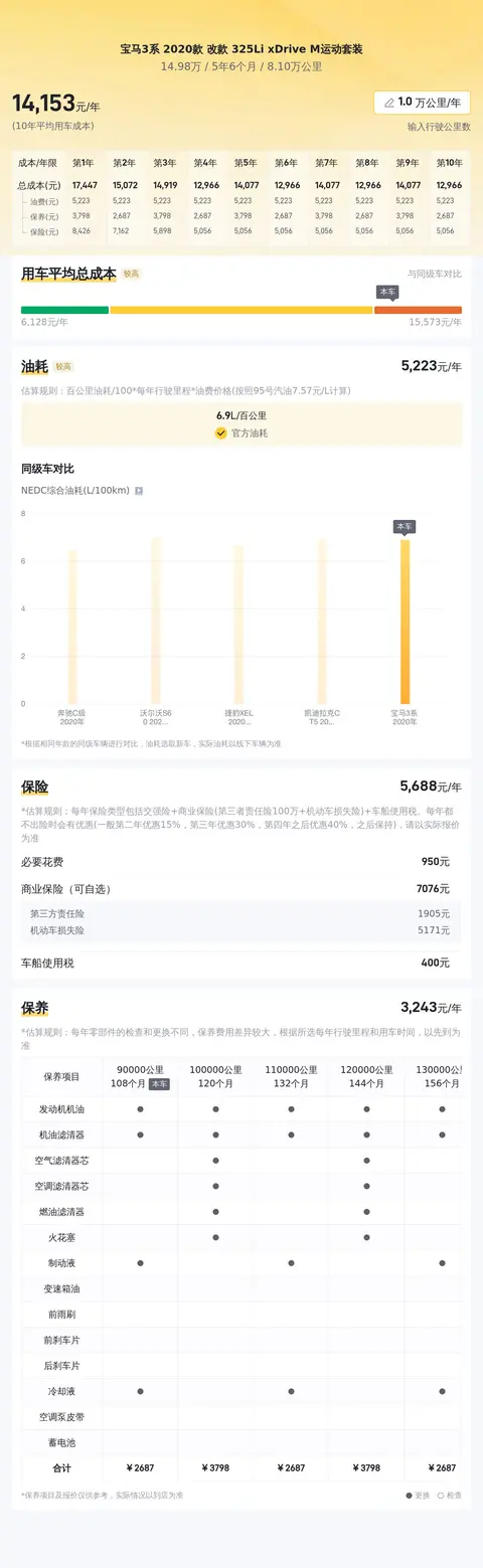 用车成本方面,这辆车的百公里油耗为6.9升,按照每年行驶一万公里计算,燃油费用约为5863元。该车商业保险预估每年约5468元,保养费用预估每年1808元。以上数据仅供参考,具体数据可能随用车成本、用车强度和驾驶习惯不同而有所差异。
