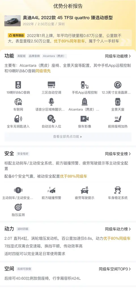 综上所述的新车含税价、用车成本、市场行情、优势分析、同款比价等数据仅供参考。在配置部分,因为二手车非标品,车辆可能会存在配置改装的情况,具体车况信息需要线下结合车辆实际情况进行综合参考。