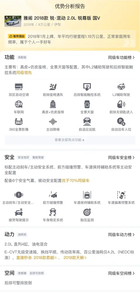 在二手车市场上,雅阁 2018款 锐·混动 2.0L 锐尊版 国V的市场行情价是10.62万-12.78万,它的报价则是11.88万,价格虽然合理,但没有明显优势,不过它的保值率较高,且0过户,加上新能源属性,这些都是加分项。
