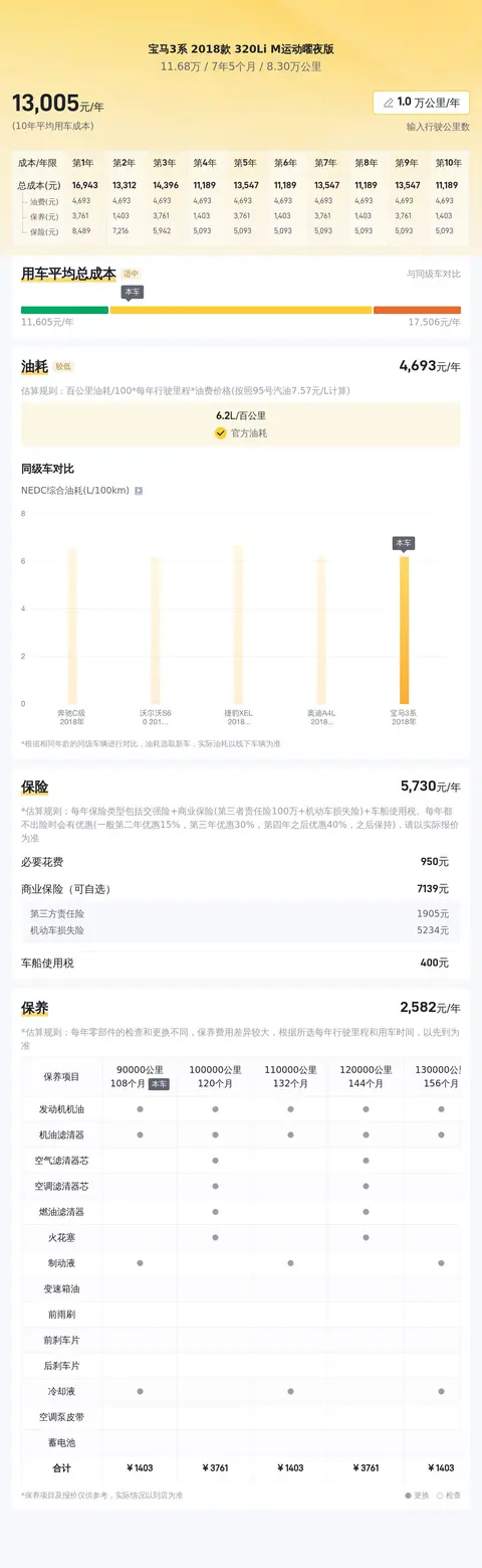在考虑购买宝马3系2018款320Li M运动曜夜版二手车时,除了购车成本外,还需要合理预期日常使用和维护的成本。以下是对该车型部分用车成本的概要分析,供您参考:燃油成本:根据实际用户反馈和官方数据,这款宝马3系的百公里综合油耗大约在6.2L左右。假设每年行驶1万公里,按当前油价计算(假设油价为8.02元/L),每年的燃油成本约为4964元。保险费用:保险费用因保险公司和保险方案的不同而有所差异。一般来说,这款车型的年度保险费用大约在5488元左右。这里假设无理赔记录,否则实际费用可能会更低。保养成本:定期保养是保持车辆良好状态的必要措施。根据宝马官方的保养计划和实际用户反馈,这款宝马3系的年度保养费用大约在3248元左右。这里假设所有保养都在4S店进行,使用原厂配件和机油。其他费用:除了上述固定成本外,还可能产生其他一些费用,如车船使用税(假设为420元/年)、停车费、洗车费、过路费、罚款等。这些费用因人而异,这里暂不计入总成本。综合考虑上述各项成本,假设每年行驶1万公里,无理赔记录,所有保养在4S店进行,这款宝马3系2018款320Li M运动曜夜版的年度用车成本大约在15450元左右。请注意,实际成本可能会根据个人使用习惯、行驶里程、保险方案等因素有所变化。