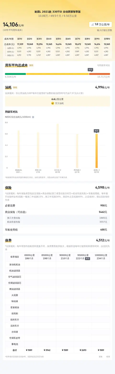 途观L 2021款 330TSI 自动两驱智享版的10年平均用车成本是13645元/年,同级车的最低是10077元/年,最高是16392元/年,所以它的用车成本适中。