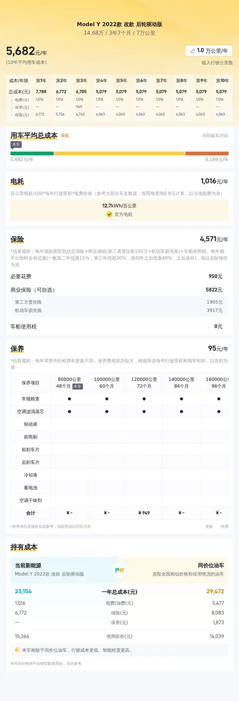 在用车成本方面,这辆二手Model Y 2022款后轮驱动版的表现相当出色。根据相关数据显示,这辆车每年的电费大约为2536元,而同级别的汽油车每年的油费则高达5109元。这意味着,相比于燃油车,这辆车每年可以为您节省大约2573元的能源费用。此外,这辆车在两年内仅行驶了6万公里,这意味着它在未来的两年内,保养费用将控制在2000元以内。这一数字低于许多同级别车型的保养费用,进一步降低了您的用车成本。总的来说,这辆车在用电成本和保养费用方面,都表现出了明显的节约优势,为车主提供了更加经济实惠的用车体验。