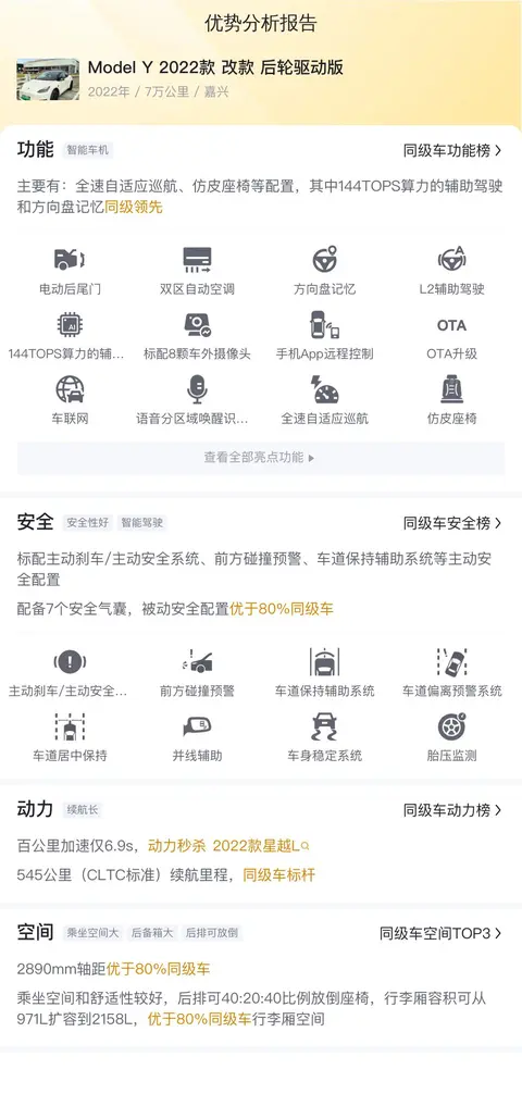 这辆二手Model Y 2022款后轮驱动版在多个方面展现出显著优势。首先,作为特斯拉的明星车型,它拥有出色的续航能力和较快的充电速度,为驾驶者提供了便捷的出行体验。其次,车辆外观保持得当,内饰整洁如新,显示出较低的使用频率和良好的维护状况。此外,车辆配置丰富,包括全速自适应巡航、L2级辅助驾驶系统、仿皮座椅等功能,提升了驾驶的舒适性和安全性。然而,作为电动汽车,它也存在一些劣势。电池容量和续航里程可能随时间和使用而逐渐衰减,影响长期性能。而且,作为高端品牌,其维修保养成本相对较高,可能不适合预算有限的消费者。最后,二手车市场对电动汽车的评估不够成熟,可能影响车辆的保值率。尽管如此,这辆车在综合性能、使用成本和外观内饰等方面的优势仍然十分突出,是一款值得考虑的二手车选择。