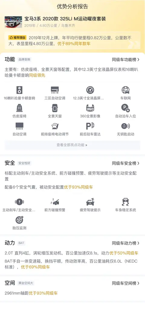这辆宝马3系 2020款 325Li M运动曜夜套装上牌地为新疆乌鲁木齐,上牌日期2019年12月,表显里程4.80万公里,有1次过户记录。新车指导价36.39万,文中介绍的这辆二手车报价16.98万,包过户费,可接受置换,首付5.09万即可开回家。