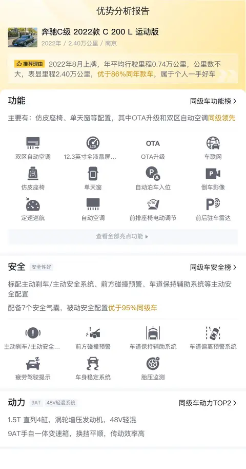 这辆二手奔驰C级 2022款 C 200 L 运动版轿车,车源地南京,上牌地南京,上牌时间2022年8月,表显里程2.4万公里,新车指导价32.52万,二手车报价18.58万,过户次数0次,车身颜色为深灰色,排放标准国VI。