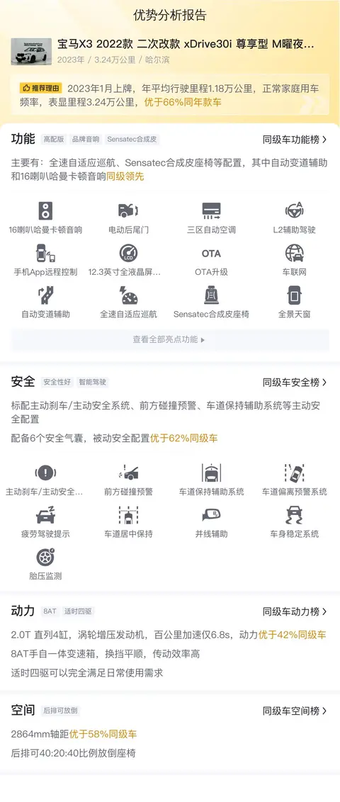 综上所述的新车含税价、用车成本、市场行情、优势分析、同款比价等数据仅供参考。在配置部分,因为二手车非标品,车辆可能会存在配置改装的情况,具体车况信息需要线下结合车辆实际情况进行综合参考。