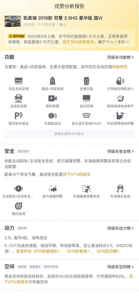 据估算,同级车的最低用车成本是6406元/年,最高是13889元/年,凯美瑞 2019款 双擎 2.5HG 豪华版国VI是9459元/年,用车成本适中。