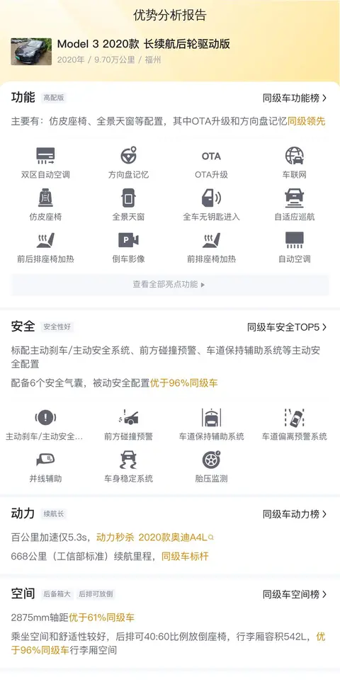 用车成本方面,这辆Model 3 2020款 长续航后轮驱动版在10年内的平均用车成本约为25407元/年,相较于其他竞品车型,这一用车成本属于较高水平。这主要是由于电费、保险费用以及保养费用等综合因素所导致的。