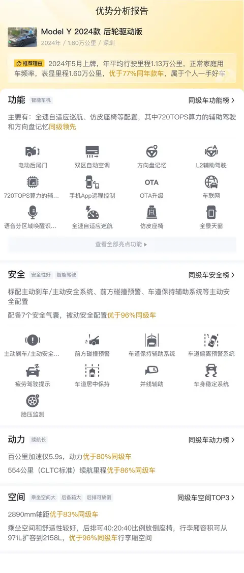 优势:Model Y 2024款 后轮驱动版的市场行情价是16.79万-19.64万,它的报价则是19.65万,报价合理,且这款车属于热门车型,市场欢迎度高,保值率高。本身里程不高,状态良好,配置丰富,使用体验好。