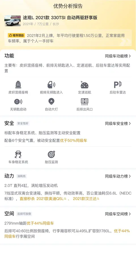 据估算,同级车的最低用车成本是5339元/年,最高是16466元/年,途观L 2021款 330TSI 自动两驱舒享版是13632元/年,用车成本比较高。