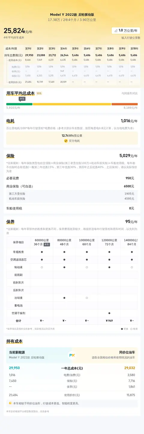 在用车成本方面,这款车的百公里耗电量为12.7kWh,按每年行驶2万公里计算,电费约为5081元。保险费用方面,预估每年约为6185元,包括交强险、商业险和车船使用税。保养费用方面,由于电动车的机械结构简单,保养项目较少,预计每年约为1638元。总体来看,这款车的年均综合用车成本约为26400元,相较于燃油车,在电费和保养费用方面具有较大优势。