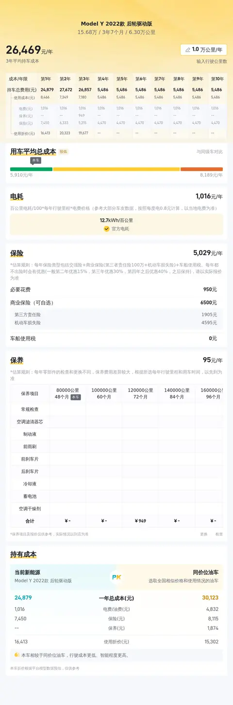 根据大数据分析,目前这款二手Model Y的市场价格比较平稳,性价比还是不错的。从用车成本来看,官方公布的百公里电耗为12.7千瓦时,大约折合每百公里电费6.8元,相较于燃油车而言,经济压力较小。按照每年行驶1万公里计算,电费支出约为680元。此外,保险费用预计约为4302元/年,保养费用约为438元/年,这些费用相较于燃油车而言也较为合理。总体而言,这款二手Model Y的用车成本相对较低,适合那些追求经济实惠的消费者。