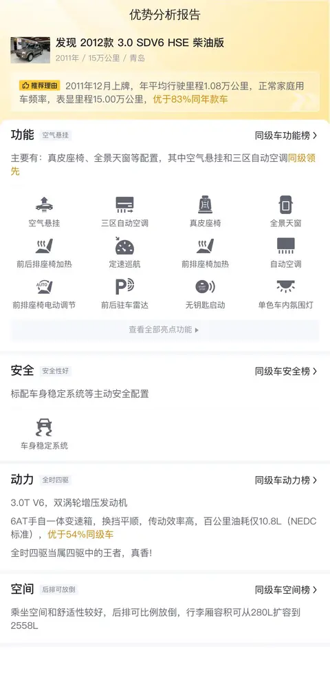 综上所述,二手路虎发现2012款3.0 SDV6 HSE柴油版在功能配置和空间表现方面均展现出了一定的竞争力。其豪华配置、安全配置以及舒适的乘坐空间和灵活的储物空间都为其作为一款高端SUV的形象增添了光彩。然而,也需要注意到该车为柴油车型,其在城市限行政策、环保趋势以及维修保养成本等方面的潜在问题也需要消费者在购买前予以充分的考虑。同时,车辆的实际状况将直接影响其价值评估和使用体验,建议在购买前进行细致的了解和实地考察。