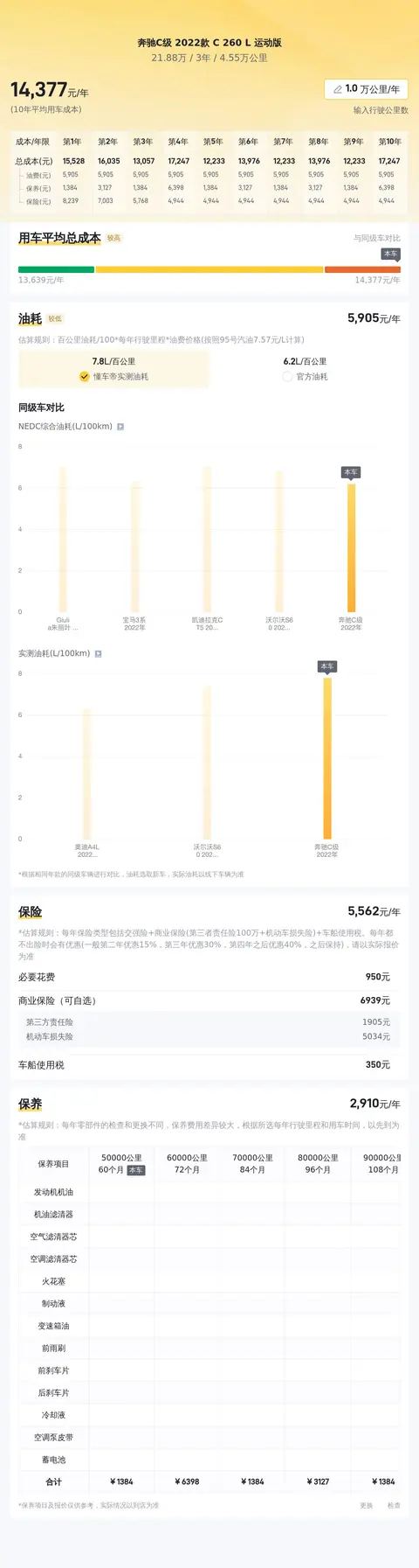 根据估算,这台奔驰C级 2022款 C 260 L 运动版的10年平均用车成本约为14187元/年,与同级别车型相比处于较高水平。这主要是因为该车的保险费用和保养费用相对较高。对于豪华品牌车型来说,较高的维护成本也是情理之中。