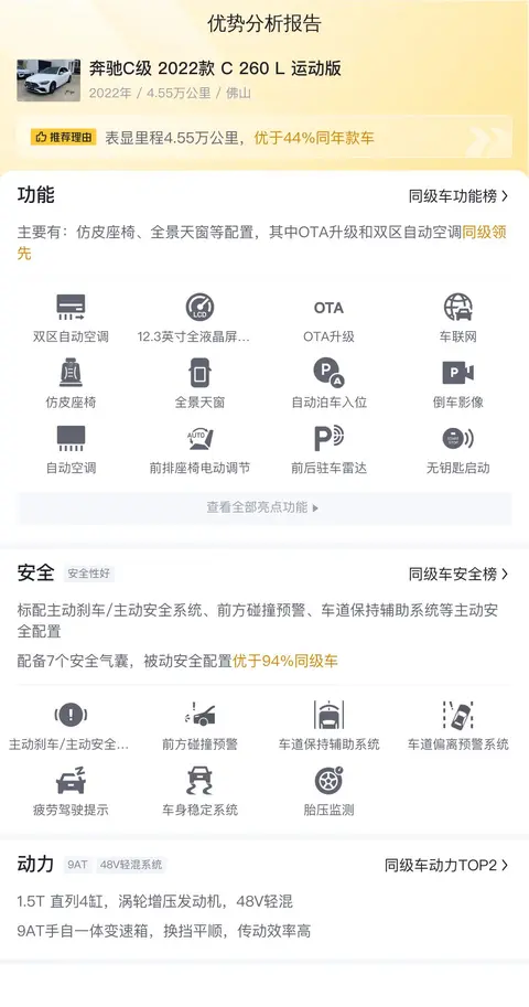 这台奔驰C级 2022款 C 260 L 运动版外观尺寸4882x1820x1461mm,轴距2954mm,这样的尺寸设计不仅保证了车内空间的宽敞,更为乘客提供了舒适的乘坐环境。车身线条流畅而优雅,既展现了奔驰一贯的高贵气质,又透露出一丝运动感。该车搭载的是一台1.5T直列4缸涡轮增压发动机,配备48V轻混系统,最大功率150kW,最大扭矩300N·m。这样的动力配置不仅保证了车辆的加速性能,还使得燃油经济性得到了优化。官方公布的0-100km/h加速时间为7.7秒,既适合日常驾驶,也能满足偶尔的高速行驶需求。与发动机相匹配的是一台9挡手自一体变速箱,它的存在让换挡更加平顺,驾驶体验更为舒适。无论是低速行驶还是高速巡航,都能为驾驶者提供流畅的驾驶感受。底盘悬挂方面,该车采用了多连杆式独立悬挂系统,既能吸收路面颠簸,又能保持车辆的稳定性,为乘客提供更加舒适的乘坐体验。制动系统方面,该车配备了通风盘式前制动器和盘式后制动器,配合电子驻车系统,确保了行车的安全性和可靠性。该车配备了ABS防抱死、制动力分配(EBD/CBC等)、刹车辅助(EBA/BA等)等一系列主动安全配置,为驾驶者提供全方位的安全保障。该车还配备了驾驶席安全气囊、副驾安全气囊、前排侧气囊等被动安全配置,以及胎压监测、防盗报警等辅助与控制系统,确保乘客的安全。座椅材质采用仿皮,既保证了舒适性,又提升了车内档次。全景天窗不仅增加了车内的采光,还为乘客提供了更加开阔的视野。此外,该车还配备了智能互联、语音识别控制等功能,让驾驶更加便捷。该车还配备了OTA升级、双区自动空调等配置,其中OTA升级功能可以及时更新车机系统,增加新功能和提升性能;双区自动空调则可以根据不同乘客的需求调节温度和风量,提供更加个性化的舒适体验。该车主要面向追求品质生活的年轻白领、商业精英以及注重生活品质的家庭用户。他们既看重车辆的豪华感和舒适性,也注重驾驶乐趣和科技感。竞品车型包括宝马3系、奥迪A4L、沃尔沃S60等。这些车型各有特色,但在豪华感、科技配置和驾驶性能等方面,奔驰C级 C 260 L 运动版依然保持着较强的竞争力。由于这台车没有检测报告,所以文中无法对车辆的车况进行详细描述,不过我们今天先以了解车型为主,同时对该车的市场行情有个初步的判断。目前这台奔驰C级 2022款 C 260 L 运动版的二手车行情大致在20.13万至24.34万之间,文中介绍的这台车售价21.88万,处于正常水平。