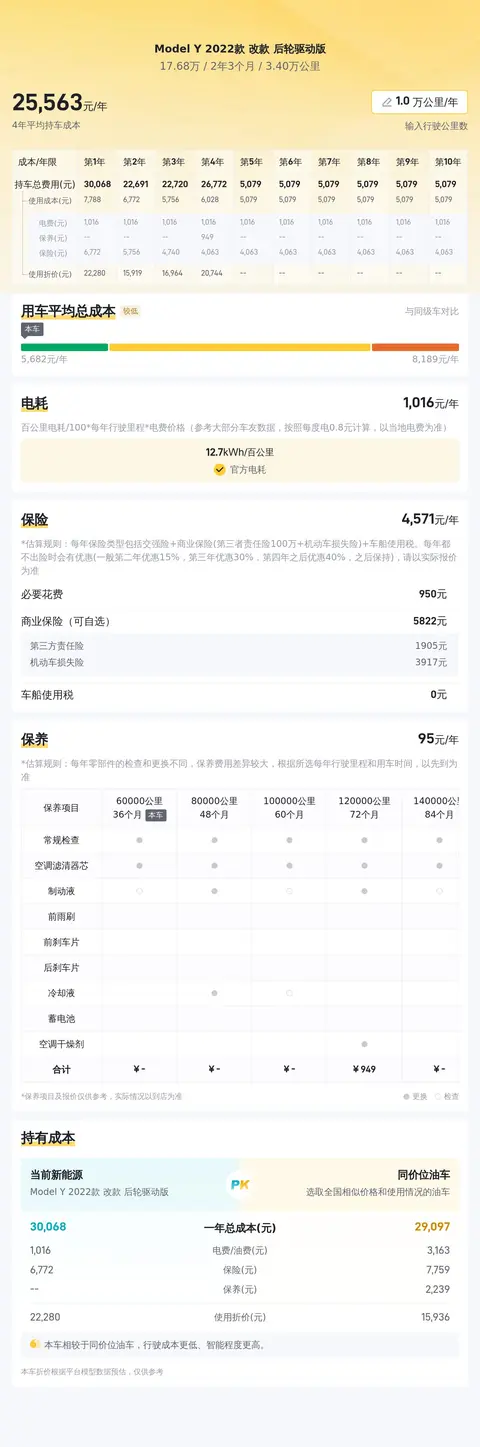 在用车成本方面,这辆二手Model Y 2022款 改款 后轮驱动版也表现出较好的经济性。根据数据。这辆车每年的电费大约为1008元。相较于燃油车来说要更加节省。同时。由于电动车的维护成本相对较低。也能为您节省不少开支。