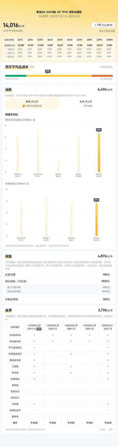 接下来,我们探讨一下大家关心的用车成本问题。当然,每个人用车的方式不同,但平均来说,这辆奥迪Q3一年的保险费用大约6200元,保养费用大概4100元,油费约6100元,其他费用根据个人情况而定,按每年2000元计算,那么一年的用车成本总计约18400元。当然,这个数字会根据你的驾驶习惯、用车频率和油价波动等因素有所变动。