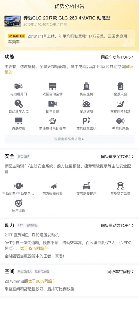 这辆二手奔驰GLC 2017款 GLC 260 4MATIC 动感型是蓝色车身,车源地和上牌地均为广州,首次上牌时间为2016年11月,表显里程为10.4万公里,有1次过户记录。新车指导价为42.9万,而现在的二手车报价仅为11.28万,相比新车价格便宜了31.62万,首付3.2万即可开回家。