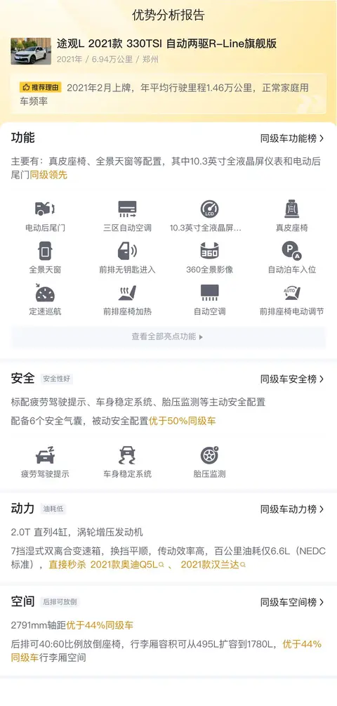 据估算,同级车的用车成本最低是6904元/年,最高是16791元/年,途观L 2021款 330TSI 自动两驱R-Line旗舰版的是13527元/年,用车成本比较高。