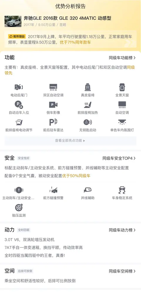 我们专业团队评估了多种因素,包括车辆的车龄、里程、过户次数及外观颜色等,并与市场上的同类车型进行了细致比较。我们自豪地承诺,这辆二手奔驰GLE的定价位于市场中高位水平,意味着它比市场上75%的同款车型更具性价比。这一承诺基于懂车帝对市场的深入理解和严格的质量把控,旨在为每一位客户提供最优质、最划算的车辆选择。