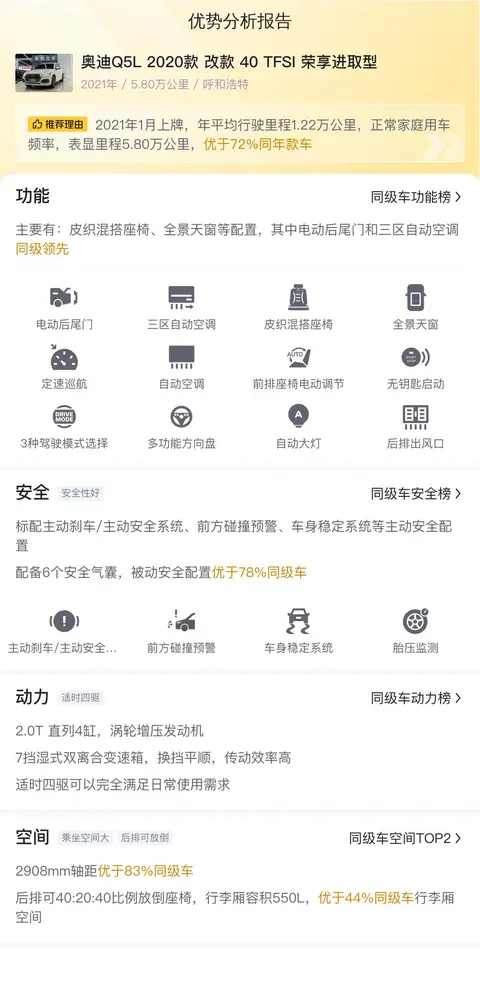 综上所述的新车含税价、用车成本、市场行情、优势分析、同款比价等数据仅供参考。在配置部分,因为二手车非标品,车辆可能会存在配置改装的情况,具体车况信息需要线下结合车辆实际情况进行综合参考。