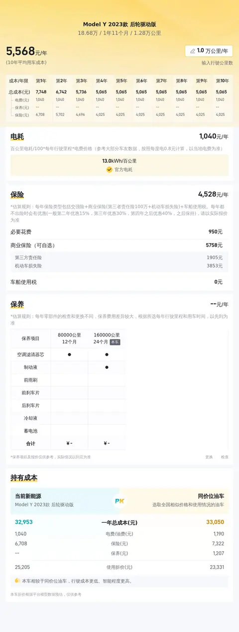 在用车成本方面,根据懂车帝的大数据分析,这辆二手Model Y 2023款后轮驱动版的10年平均成本约为6240元/年(按每年行驶1万公里计算)。相较于同级车,它的用车成本适中。