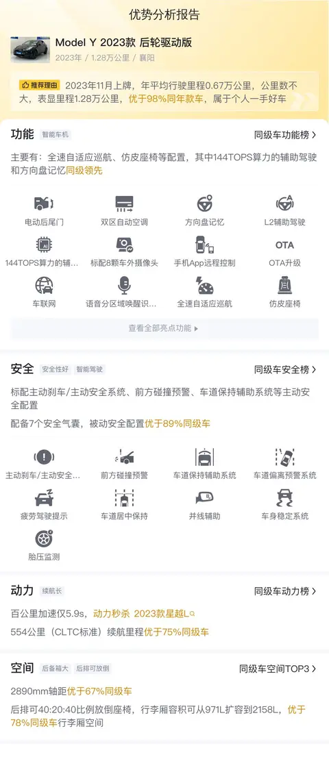 这辆二手Model Y 2023款后轮驱动版配备了全速自适应巡航、L2辅助驾驶、方向盘记忆加热等配置,其中L2辅助驾驶同级领先。在安全配置上,则标配主动刹车/主动安全系统、前方碰撞预警、车道保持辅助系统等主动安全配置,配备6个安全气囊,被动安全配置优于88%同级车。这样的配置,无疑让驾驶更加轻松,也更加安全。
