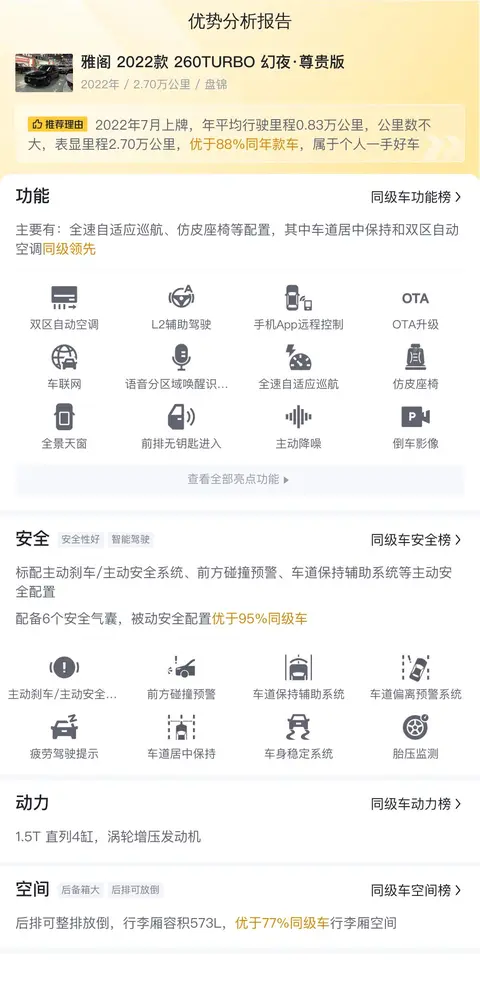 综上所述的新车含税价、用车成本、市场行情、优势分析、同款比价等数据仅供参考。在配置部分,因为二手车非标品,车辆可能会存在配置改装的情况,具体车况信息需要线下结合车辆实际情况进行综合参考。