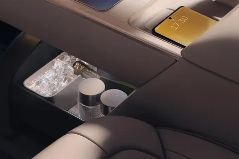 让人惊喜的是标配的车载冰箱,支持加热、冷藏和冷冻。夏天的时候,往里面放几瓶冷饮,开车的时候随时能喝到冰爽的饮料;冬天想喝热咖啡,把咖啡放进去加热,随时都能喝到热的,特别贴心。增强现实抬头显示(AR-HUD)也很实用,能把驾驶信息直接投射到前挡风玻璃上,和路面结合在一起,开车的时候不用低头看仪表盘,既能看到车速、导航这些信息,又能集中注意力看路,安全又方便。