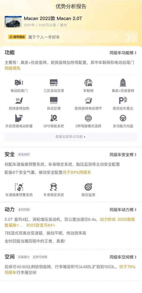 总的来说,这辆二手保时捷Macan 2022款 Macan 2.0T是一款非常值得考虑的车型。它不仅拥有保时捷品牌的独特魅力,还具备出色的性能和舒适的驾乘体验。当然,在购买二手车时,我们还需要注意车辆的实际状况、保养记录等因素。如果您对这辆车感兴趣,建议您亲自前往现场查看,并咨询专业人士的意见。