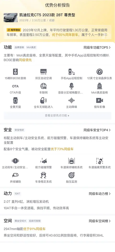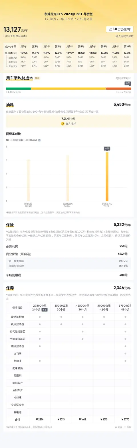 在不考虑贷款利息的情况下,这辆二手凯迪拉克CT5 2023款 28T 尊贵型的平均用车成本大约为12707元/年。其中,油费约为6140元/年,保养费用约为2678元/年,保险费用(第三者责任险100万+交强险)约为3889元/年。这些费用涵盖了车辆日常使用中的主要开支。