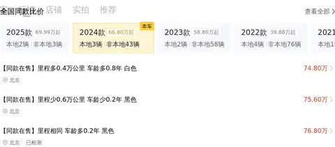 新车含税价为116.51万,现在的二手车报价是73.50万,相当于开1年多便宜了43.01万。