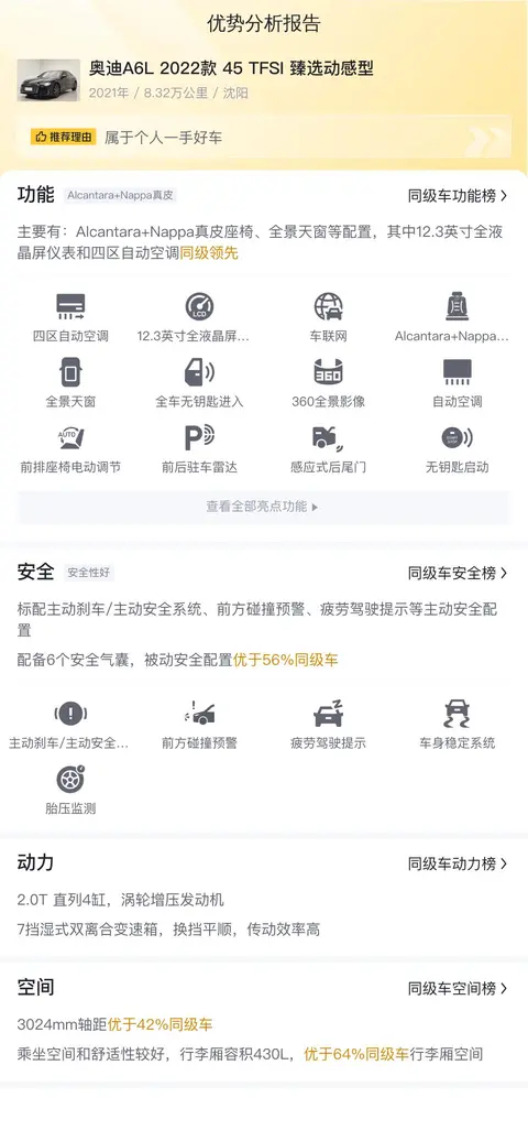 综上所述,这款奥迪A6L 45 TFSI 臻选动感型在配置、安全、动力、驾乘感受等方面均表现出色,是一款值得推荐的车型。当然,具体表现还需结合个人需求和体验来判断。