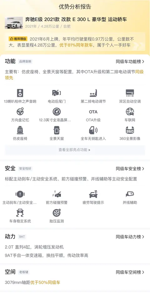 综上所述,这辆二手奔驰E级2021款改款E300L豪华型运动轿车,虽然存在一些瑕疵,但整体车况还是不错的,而且售价也比较合理。如果您正在寻找一辆豪华轿车,那么这辆车绝对是一个不错的选择。