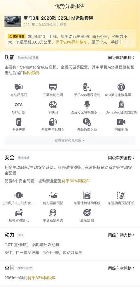 总的来说,这款宝马3系 2023款 325Li M运动套装在二手市场上表现出了较高的性价比和可靠性。它不仅继承了宝马3系一贯的卓越操控性能,还融入了众多现代化的科技配置,为驾驶者带来了更加舒适、便捷的驾驶体验。如果你正在寻找一款兼具运动性能与豪华感的二手车,那么这辆宝马3系无疑是一个不错的选择。
