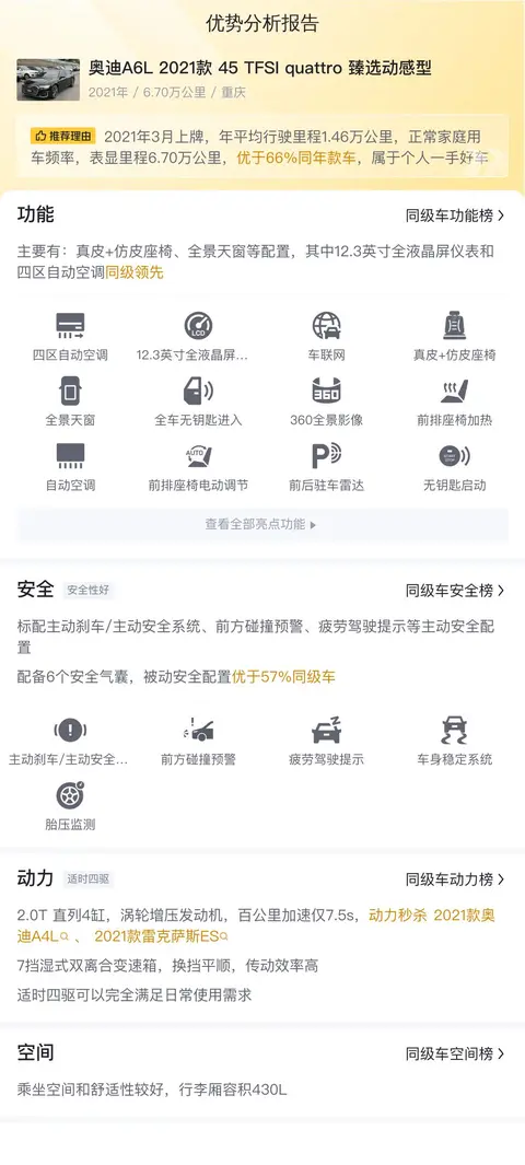 奥迪A6L 2021款 45 TFSI quattro 臻选动感型在配置、安全性、空间动力上都有一定的优势。