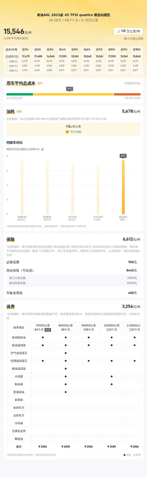 奥迪A6L 2021款 45 TFSI quattro 臻选动感型的10年平均用车成本是13133元/年,和同级车相比,用车成本适中。