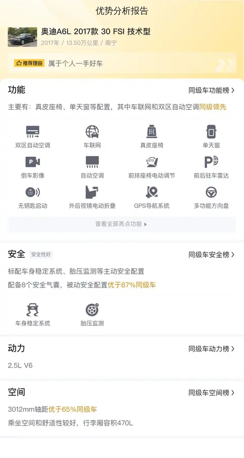 根据懂车帝平台的数据分析,这辆奥迪A6L 2017款 30 FSI 技术型的综合性价比指数为77%,在同级别车型中表现优秀。它的保值率高于同级车,市场热度也相对较高。同时,它的配置丰富、空间宽敞、动力充沛,能够满足消费者的各种需求。因此,可以说这是一辆值得推荐的二手车。