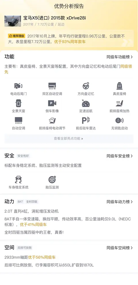 宝马X5(进口) 2015款 xDrive28i作为一款豪华SUV,其主要卖点在于其出色的动力性能、豪华配置和品牌影响力。它搭载的2.0T发动机提供了强劲的动力输出,配合8速手自一体变速箱,实现了快速和平稳的加速体验。全时四驱系统则确保了车辆在各种路况下都能保持稳定的行驶状态。车内采用真皮座椅、全景天窗等豪华配置,为乘客提供了舒适的乘坐环境。此外,宝马品牌自身的高端定位和良好口碑也为其增加了不少吸引力。宝马X5(进口) 2015款 xDrive28i在市场上的竞争力主要来源于其品牌影响力、豪华配置和性价比。首先,宝马品牌一直以来都以其卓越的品质和先进的技术著称,消费者对于宝马车型的信任度较高。其次,这款车在配置上与同类车型相比并不落下风,甚至在某些方面更具优势。最后,相较于新车价格,二手车的价格更为亲民,对于预算有限的消费者来说更具吸引力。