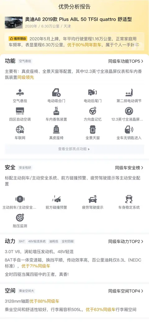 综上所述的新车含税价、用车成本、市场行情、优势分析、同款比价等数据仅供参考。在配置部分,因为二手车非标品,车辆可能会存在配置改装的情况,具体车况信息需要线下结合车辆实际情况进行综合参考。